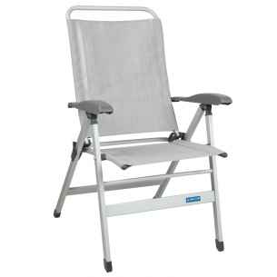 Silla Confort. Esta silla de camping combina calidad y comodidad. Cuenta con un respaldo con 7 posiciones ajustables para una gran comodidad. Su tela trenzada prémium es resistente a los rayos UV, a la intemperie y a la suciedad, y además también es fácil de limpiar. Su estructura de aluminio permite un uso intensivo durante mucho tiempo y su ligereza permite un transporte fácil. Esta silla, especialmente diseñada para los campistas y para un uso recreativo, será la compañera ideal en sus escapadas en vehículo recreativo.