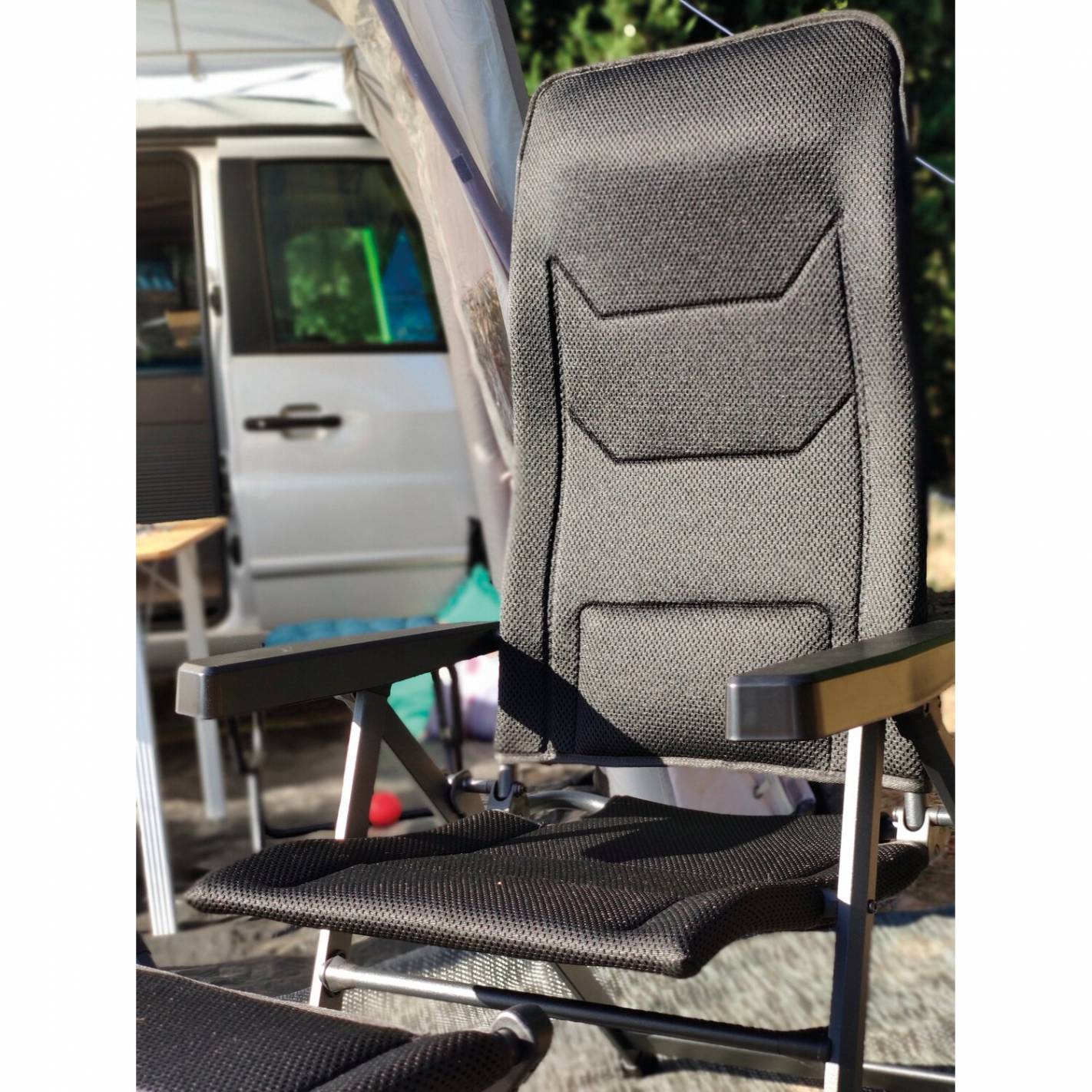 El sillón de camping Major Negro es ultra cómodo para relajarse al sol y al aire libre. Puedes utilizarlo durante tus excursiones en vehículos recreativos (autocaravana, furgoneta camperizada, caravana, barco, furgoneta...). El asiento de camping tiene un diseño elegante y moderno. Es muy cómodo y está hecho de una tela de malla 3D transpirable de alta calidad, es decir, que permite que circule el aire. También es resistente a los rayos UV. El respaldo ergonómico es ajustable en 5 posiciones diferentes. ¡Puedes encontrar la posición perfecta para relajarte! Además, el respaldo es alto y acolchado para adaptarse perfectamente a tu morfología. Del mismo modo, el armazón de aluminio gris oscuro es muy resistente. Robusto, el sillón puede soportar hasta 120 kg. El sillón de camping tiene reposabrazos y un reposacabezas integrado para favorecer una mejor relajación. Ultracomfortable, el sillón Major Negro es versátil. De hecho, puede utilizarse como sillón de relax, pero también alrededor de una mesa exterior para comer.