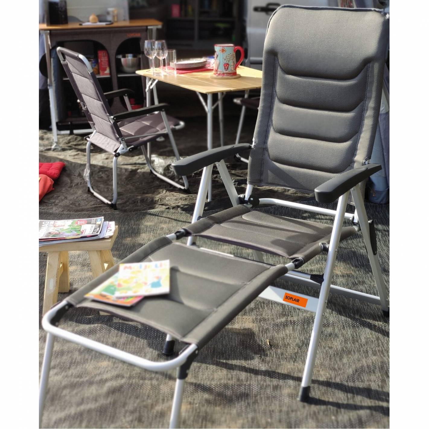 La silla de camping Eden puede utilizarse como tumbona, y además con mayor Confort. El reposapiernas Soplair es compatible con la silla de camping (se pide por separado). Basta con encajarlo en el asiento de la silla. Así podrá descansar después de una actividad al aire libre y estirar las piernas como en una tumbona de camping.